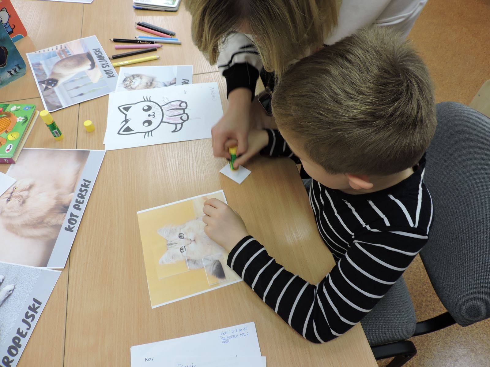 Anielka, Igor i Czarek w dużym skupieniu oglądali zdjęcia różnych ras kotów i słuchali opowieści: „Ciekawski kotek” Zbigniewa Dmitrocy oraz „ Nie Nunusiu! Tak, Nunusiu! Anity Głowińskiej. W części praktycznej dzieci z pomocą pań kolorowały i wyklejały własne kotki.