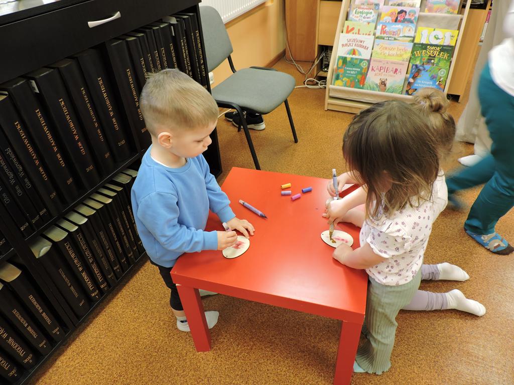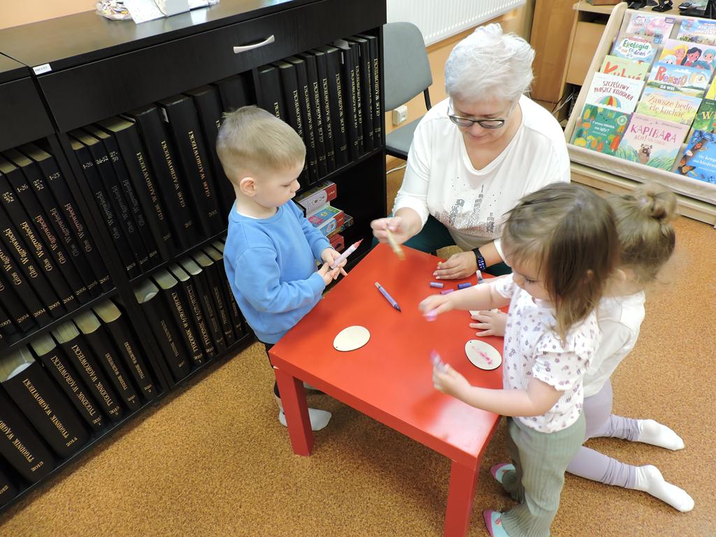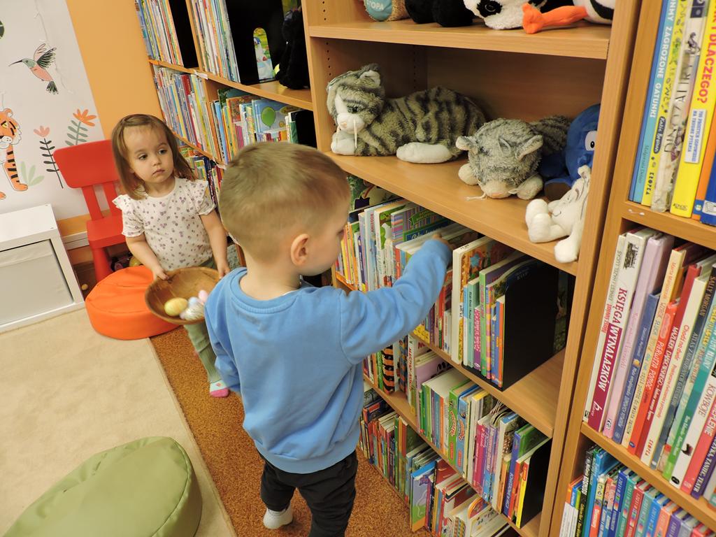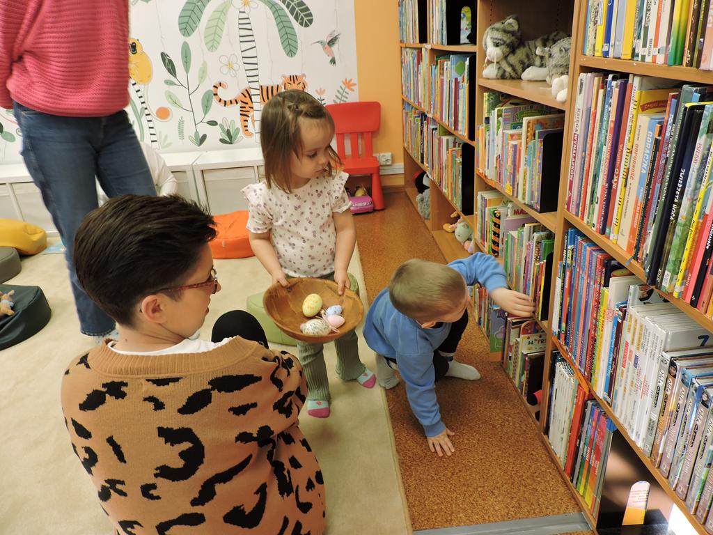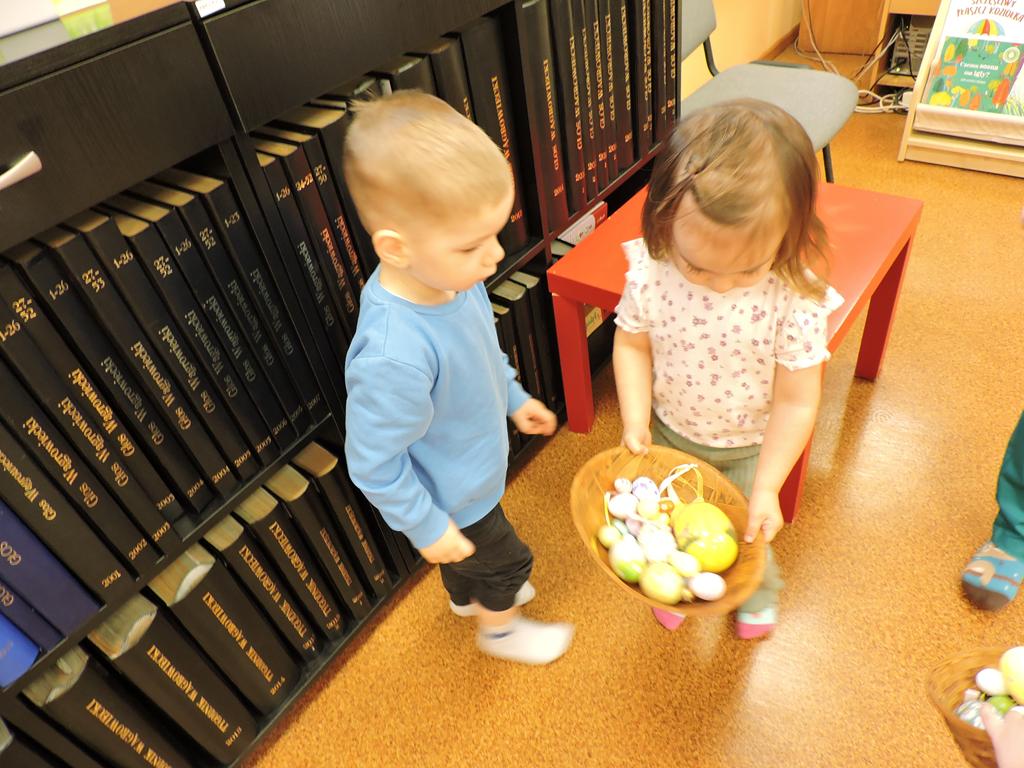 Na przedświątecznym spotkaniu Klubu Małego Czytelnika czytaliśmy dziś trzy książeczki: "Awanturka o jajka z wiejskiego podwórka" Urszuli Kozłowskiej, "Urocze kaczuszki" i "Trzy kaczuszki". Maluchy szukały też pisanek poukrywanych na bibliotecznych półkach, tańczyły oraz ozdabiały jajka.