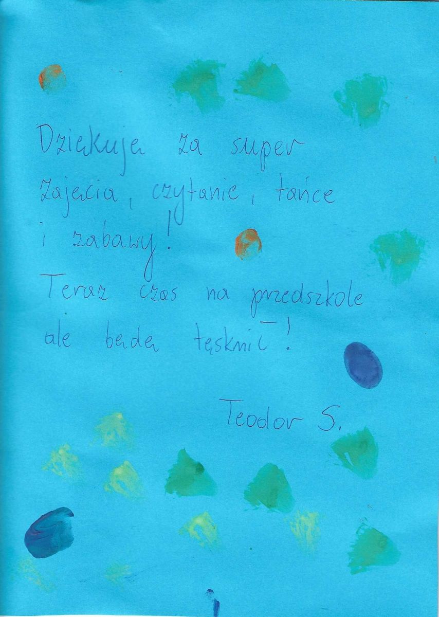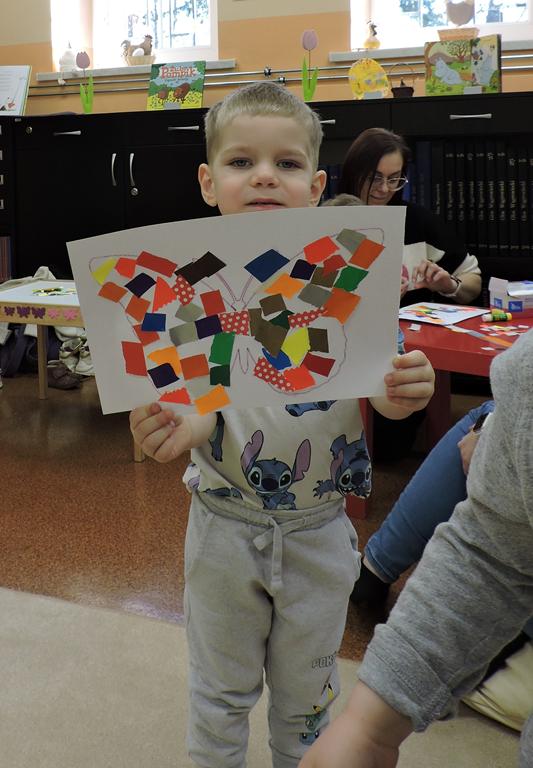 Po tym ciężkim wyzwaniu, nadszedł czas zabawy ruchowej do piosenek o wiośnie. Następnie dzieci fragmentami wycinanki wyklejały kolorowe motyle. Na koniec Teodor pożegnał się z grupą ponieważ był to jego ostatni dzień przed pójściem do przedszkola. Będziemy tęsknić:(